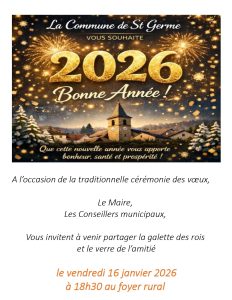 Le maire et le conseil municipal invitent la population à la cérémonie des voeux le vendredi 16 janvier 2026 à 18h30 au foyer rural.